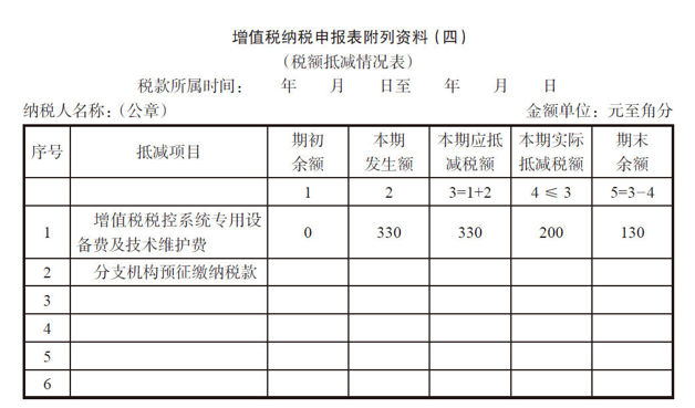 次月增值税纳税申报时,注意填报附表四,其中“本期实际递减税额”为330,“期末余额”为330-200=130元,留待以后月份抵减,如图3-11所示。