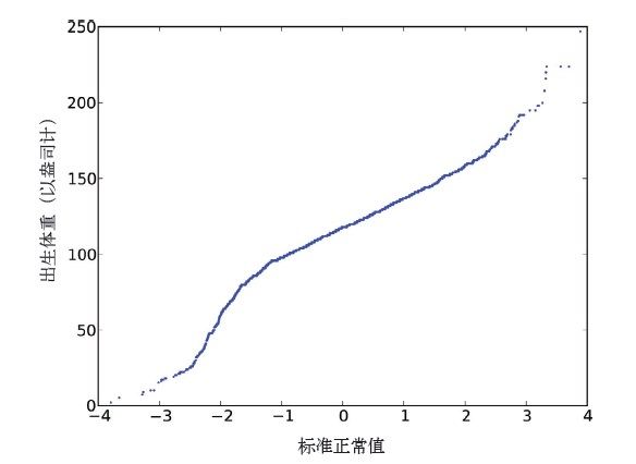 图4-7是一个简单的出生体重正态概率图。这个图的曲度表示数据集跟正态分布的差异;毕竟,在很多情况下,正态分布都是一个很好(至少是足够好)的模型。